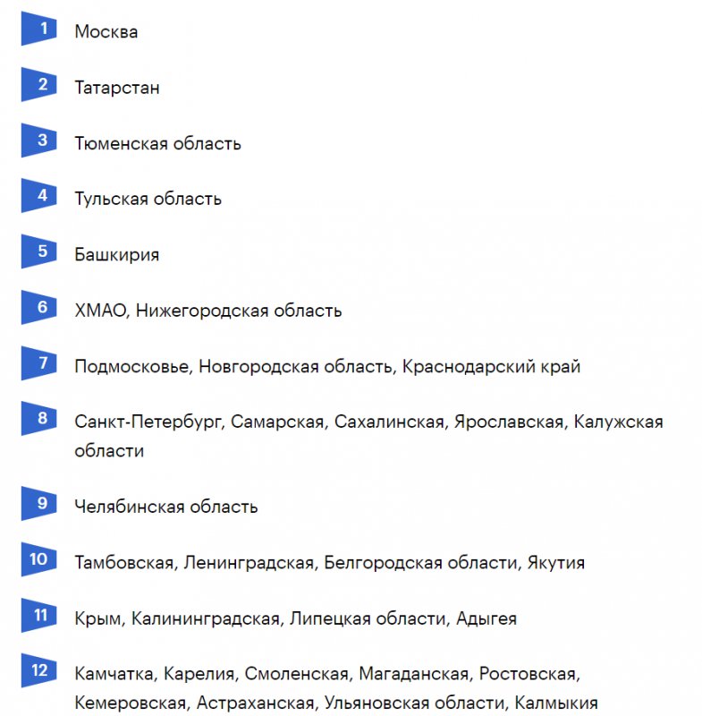 Предыдущие 11 мест разделили 24 региона. Лидерами стали Москва, Татарстан, Тюменская область, Тульская область, Башкирия.