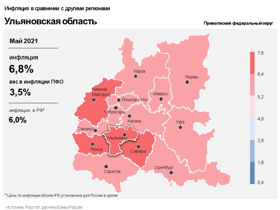 Годовая инфляция в Ульяновской области в мае 2021 года составила 6,78% после 6,52% месяцем ранее, превысив значение в Приволжском федеральном округе (6,3%) и России в целом (6,02%).