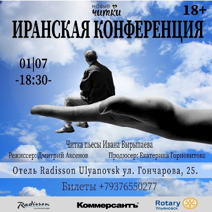 1 июля в 18.30 на летней террасе отеля Radisson в рамках проекта современной драматургии «Новые читки» предприниматели Ульяновска представят пьесу известного драматурга Ивана Вырыпаева «Иранская конференция».