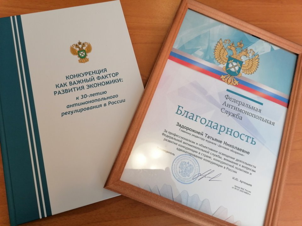 Благодарность главному редактору ульяновского бизнес-журнала Татьяне Задорожней – «За профессионализм и объективное освещение деятельности Федеральной антимонопольной службы, внимание к вопросам развития конкуренции в стране, конкурентной политики и адвокатирование конкуренции в России» подписал руководитель ФАС России Игорь Артемьев.