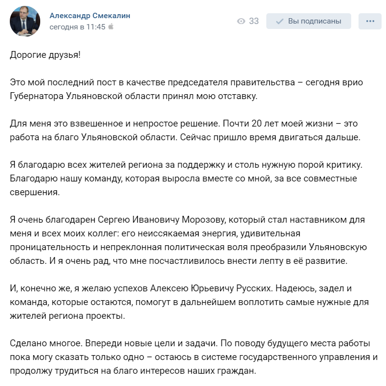 «Это мой последний пост в качестве председателя правительства – сегодня врио Губернатора Ульяновской области принял мою отставку. Для меня это взвешенное и непростое решение. Почти 20 лет моей жизни – это работа на благо Ульяновской области. Сейчас пришло время двигаться дальше», – написал Александр Смекалин на своей странице в VK.