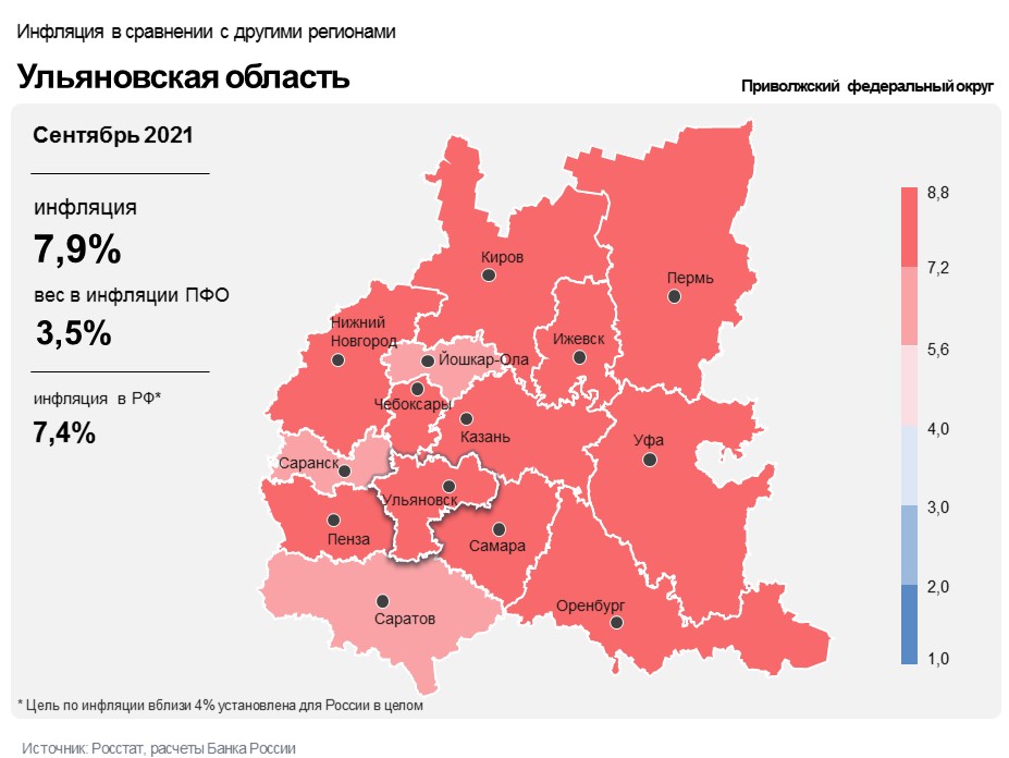 В целом годовая инфляция в Ульяновской области в сентябре 2021 года составила 7,87% после 6,99% месяцем ранее. Это выше, чем в Приволжском федеральном округе (7,64%) и России в целом (7,40%).
