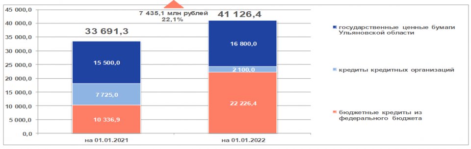 По итогам 2021 года государственный долг Ульяновской области увеличился на 7,4 млрд рублей (+22,1%) и достиг 41,1 млрд рублей. Об этом сообщается в отчете исполняющей обязанности министра финансов региона Натальи Брюхановой по итогам 2021 года, опубликованном на сайте Заксобрания.