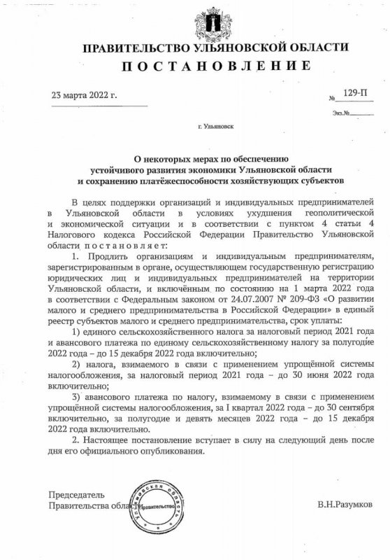 Председатель правительства Ульяновской области Владимир Разумков подписал постановление о переносе сроков уплаты платежей по упрощенной системе налогообложения и единому сельскохозяйственному налогу.