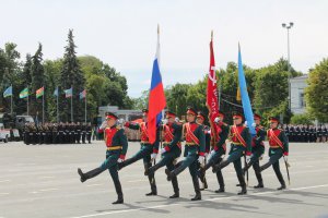 Для прохождения торжественным маршем по центральной площади города были привлечены расчеты территориального военного гарнизона, а также представители Министерства обороны, других ведомств и учебных заведений. По Соборной площади в честь 77-й годовщины Великой Победы промаршировало более 1500 человек.