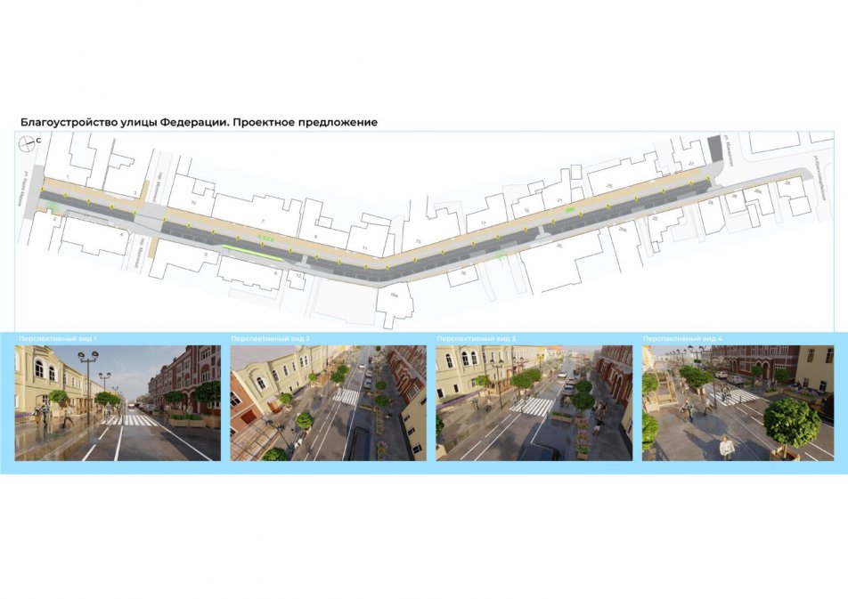 По словам главы города Дмитрия Вавилина, на следующей неделе планируют начать работы по благоустройству улицы Федерации. Так, до 1 августа подрядчики будут прокладывать канализацию и заниматься укладкой линий электропередач в подземный кабель-канал. До 15 октября планируется завершение укладки плитки и асфальтирование дороги.