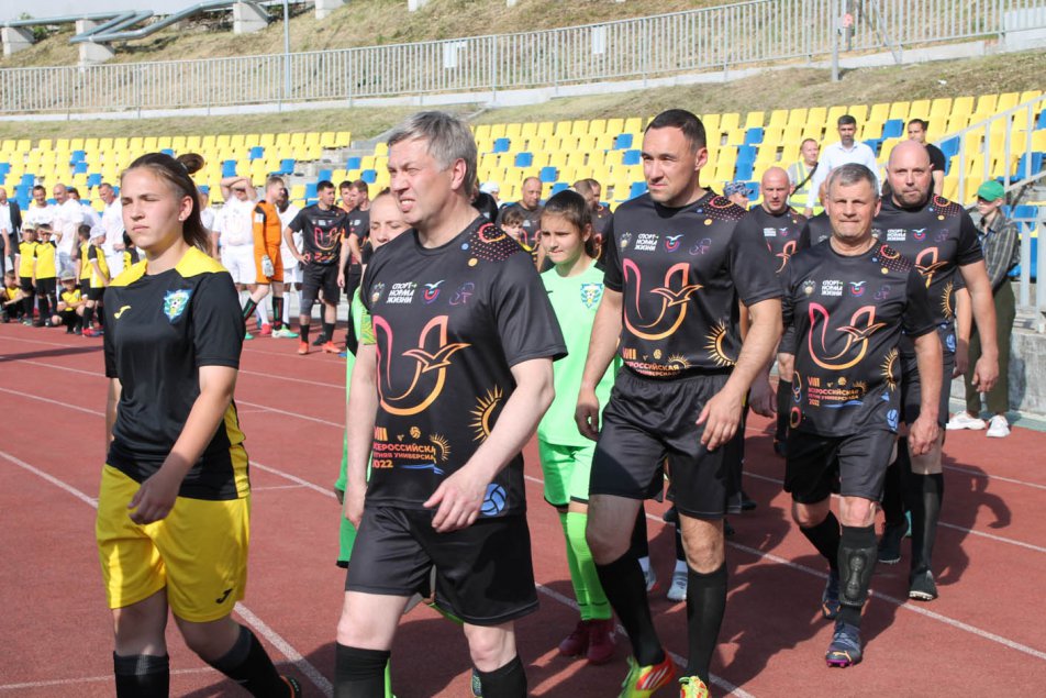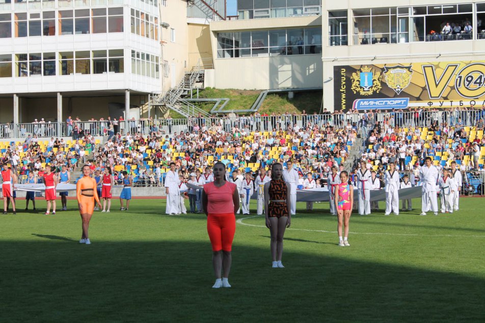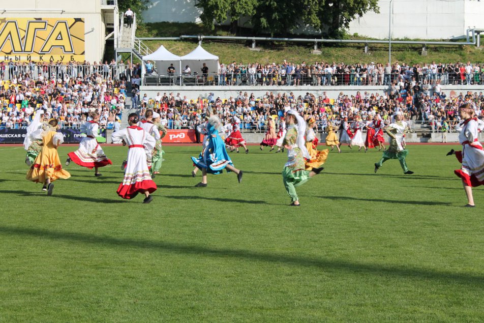 После завершения необычного матча на стадионе началась красочная церемония открытия, участие в которой приняли ведущие творческие коллективы и спортсмены региона.