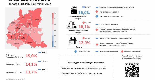 Инфляция за 2022 год в Ульяновске снизилась до 15% по отношению к августовским 15,6%. Основными факторами, которые повлияли на этот процесс, стали сдержанная потребительская активность и расширение предложения на ряд категорий товаров. Среди последних следует выделить продукты питания: годовой прирост цен на них уменьшился почти на 2% по сравнению с последним летним показателем.