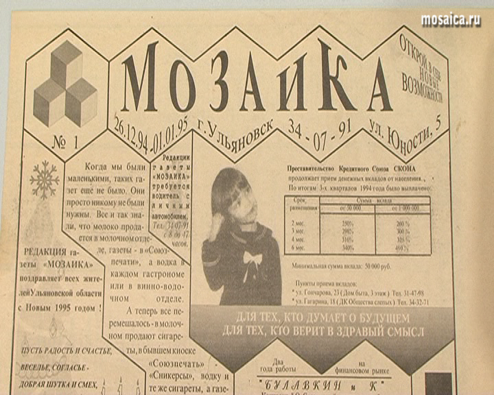 В ноябре 1994 года в Ульяновске впервые прозвучало название нового проекта – «Мозаика». На тот момент для жителей города это было новое, незнакомое пока явление, но за 28 лет все сильно изменилось. Газета выросла в большой медиахолдинг, объединивший ведущие информационно-рекламные площадки региона.