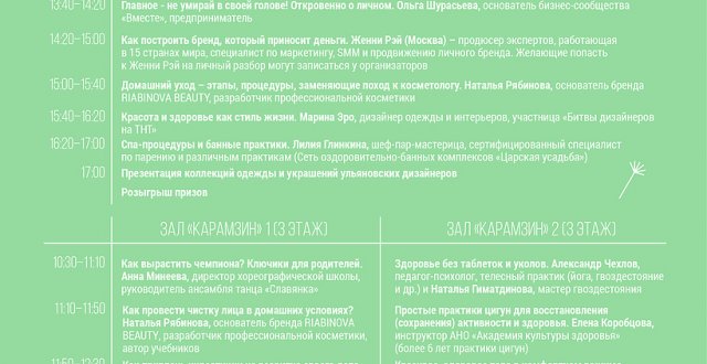 С 10 до 18 ч. вас ждут выступления и экспресс-консультации специалистов, мастер-классы по визажу и телесным практикам, диагностика кожи лица на аппарате клиники La Biosthetique, шоу «Преображение» от стилистов салона красоты «ГРАНИ», маркет товаров и услуг для здоровья и красоты, а также розыгрыш подарков от партнеров.